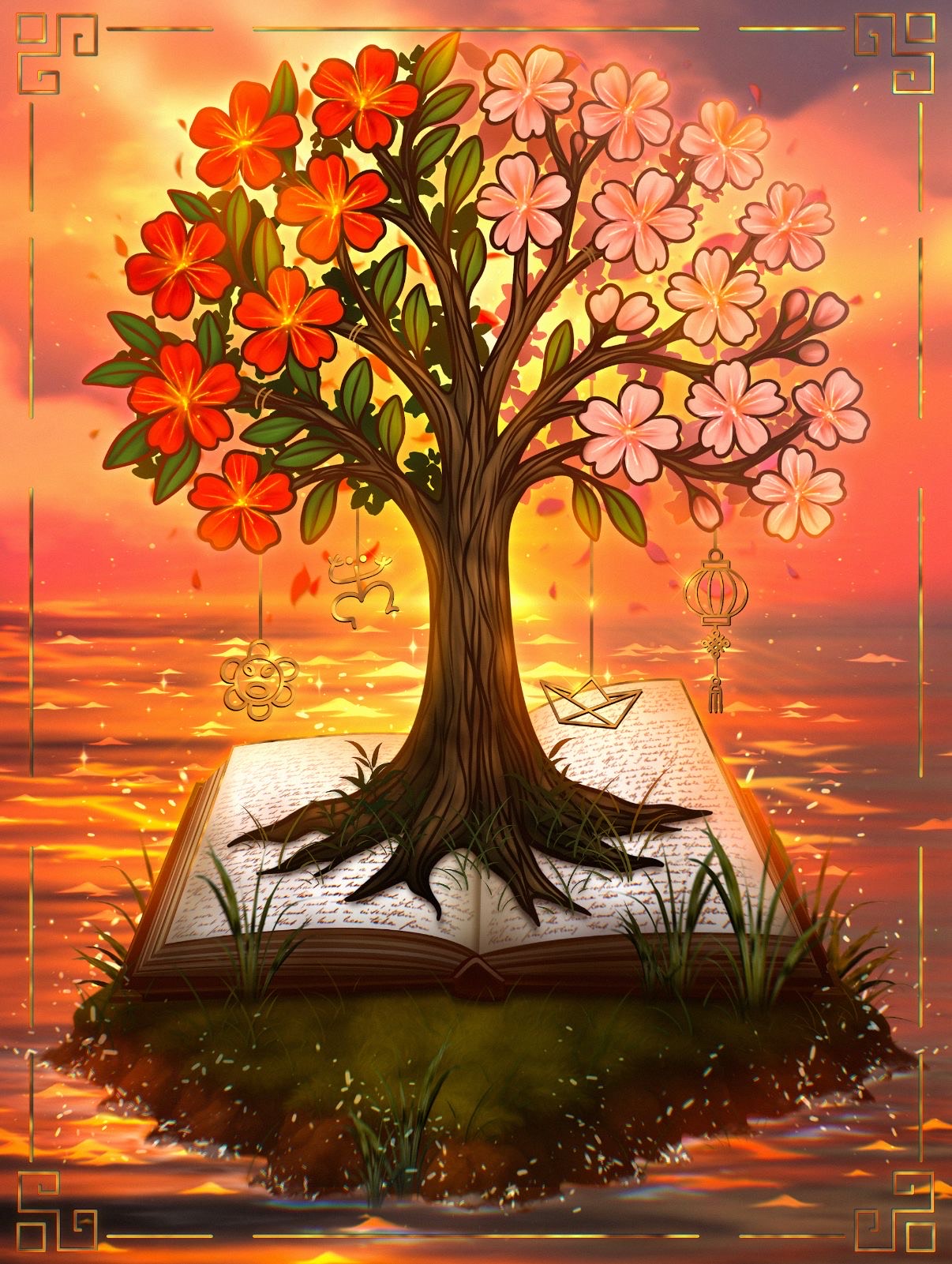 Island Time Reading embodies beautifully our identity, featuring a Flamboyant Tree, a prominent symbol of Puerto Rican culture, alongside a Sakura Tree, which holds significant meaning in various Asian cultures, including Chinese. This imagery, set against a backdrop of a sunset illuminating an island, signifies the resilience and fleeting beauty of life.